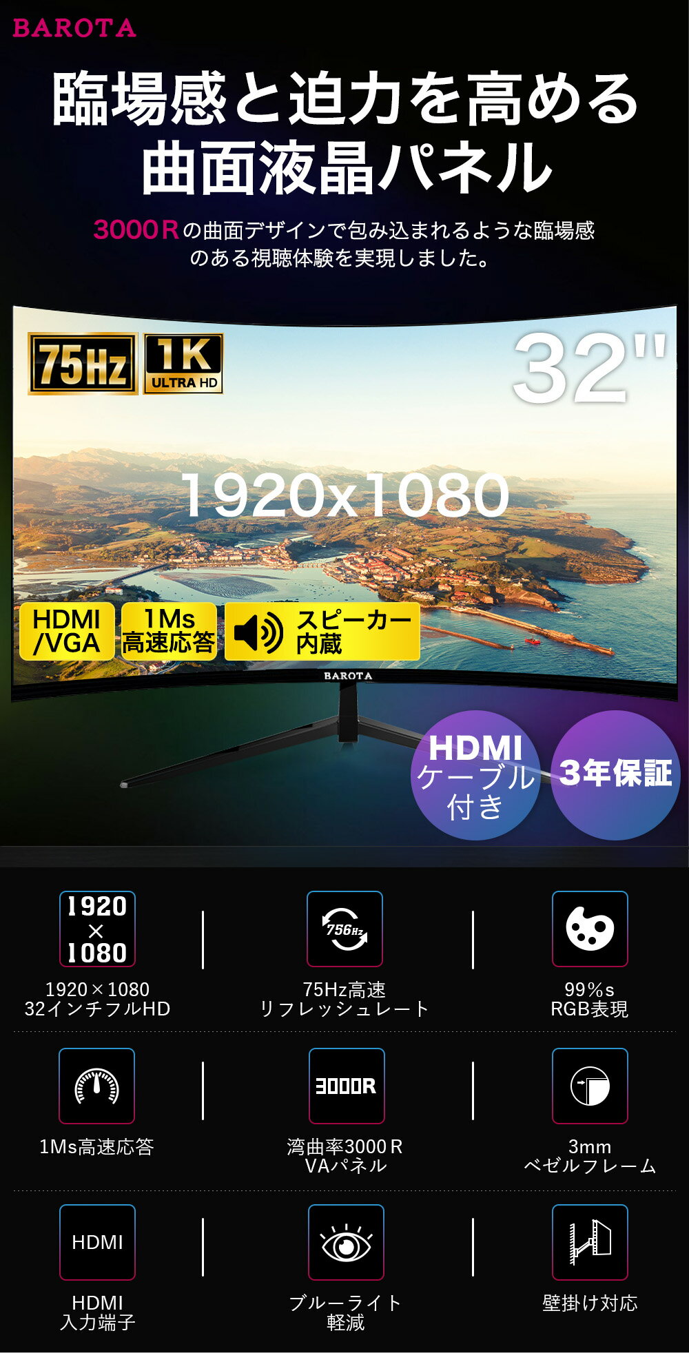 液晶ディスプレイ 32インチ 曲面 超薄型 スピーカー内蔵 178°広視野角 ブルーライト軽減 99%sRGB フルHD 75Hz 1ms応答 湾曲率3000R 高い色再現性HDMIケーブル VGA対応 スリムベゼル フリッカーフリー テレワーク ゲーミングモニター PS4 XBOX Switch対応 壁掛け