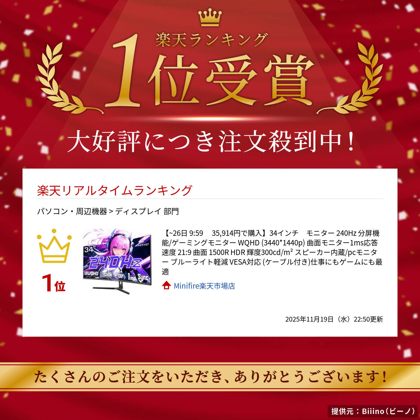 【~12/11日 6,421円割引→34,859円】34インチ モニター 240Hz 分屏機能/ゲーミングモニター WQHD (3440*1440p) 曲面モニター1ms応答速度 21:9 曲面 1500R HDR 輝度300cd/m² スピーカー内蔵/pcモニター ブルーライト軽減 VESA対応 (ケーブル付き)仕事にもゲームにも最適