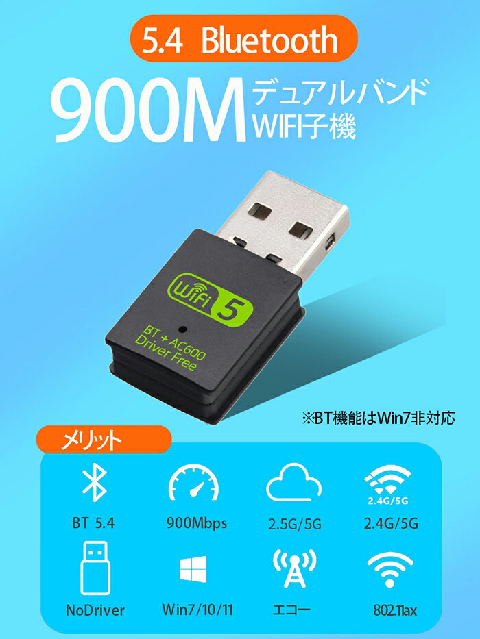 USB WiFi Bluetoothアダプター 900Mbps デュアルバンド 2.4/5GHz Wi-Fi6 BT5.4 ドライバー内蔵 ワイヤレスネットワークカード PC/ラップトップ/デスクトップ用 USB WiFiドングル 無線LAN子機 Windows 7/10/11対応 802.11ax